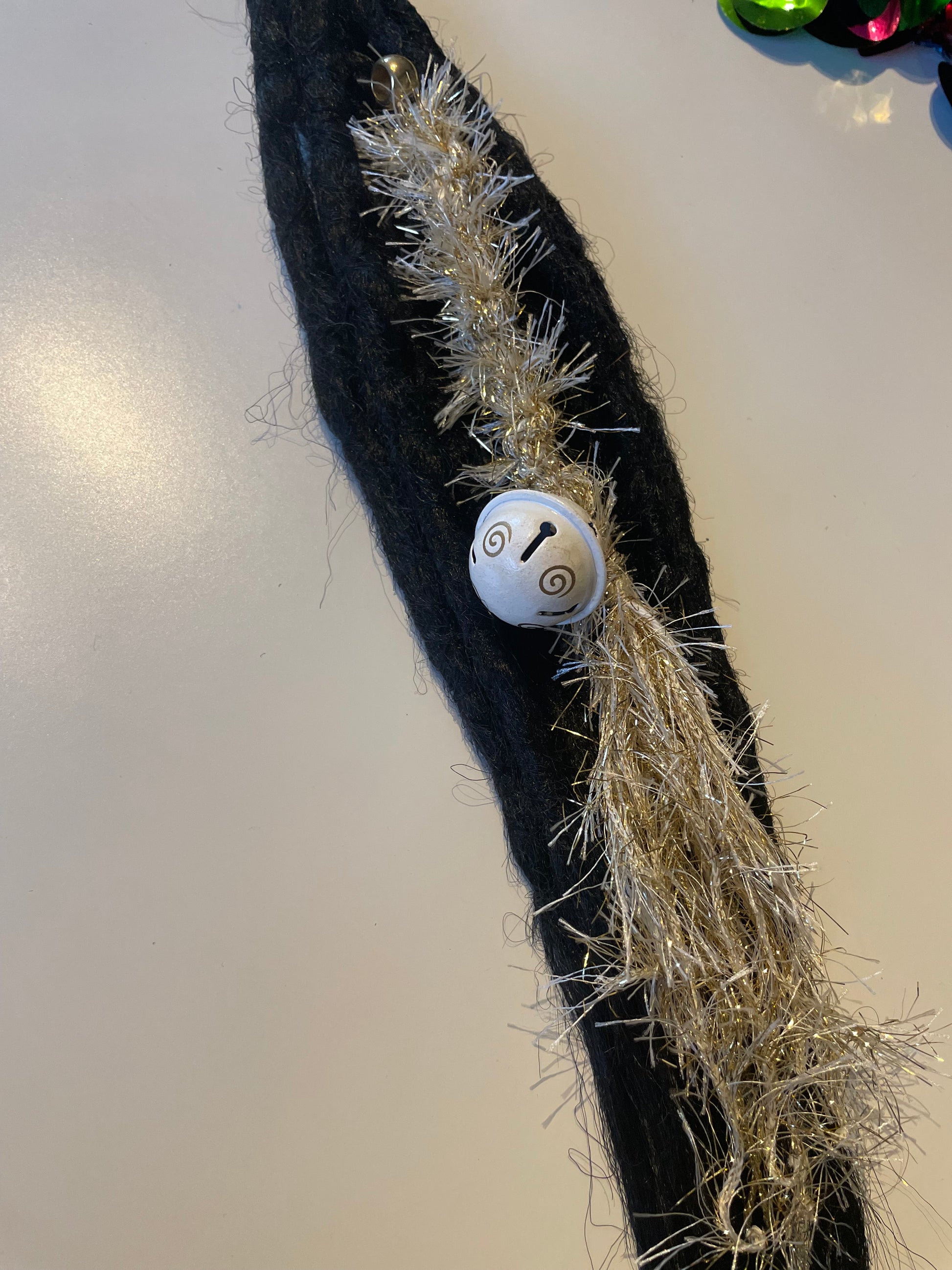 Hanging upon a gold plated 7mm bead, this dazzling gold & white tinsel wraps holds some festive cheer with a massive jingle bell. Be that sparkly jingly dreadhead ✨