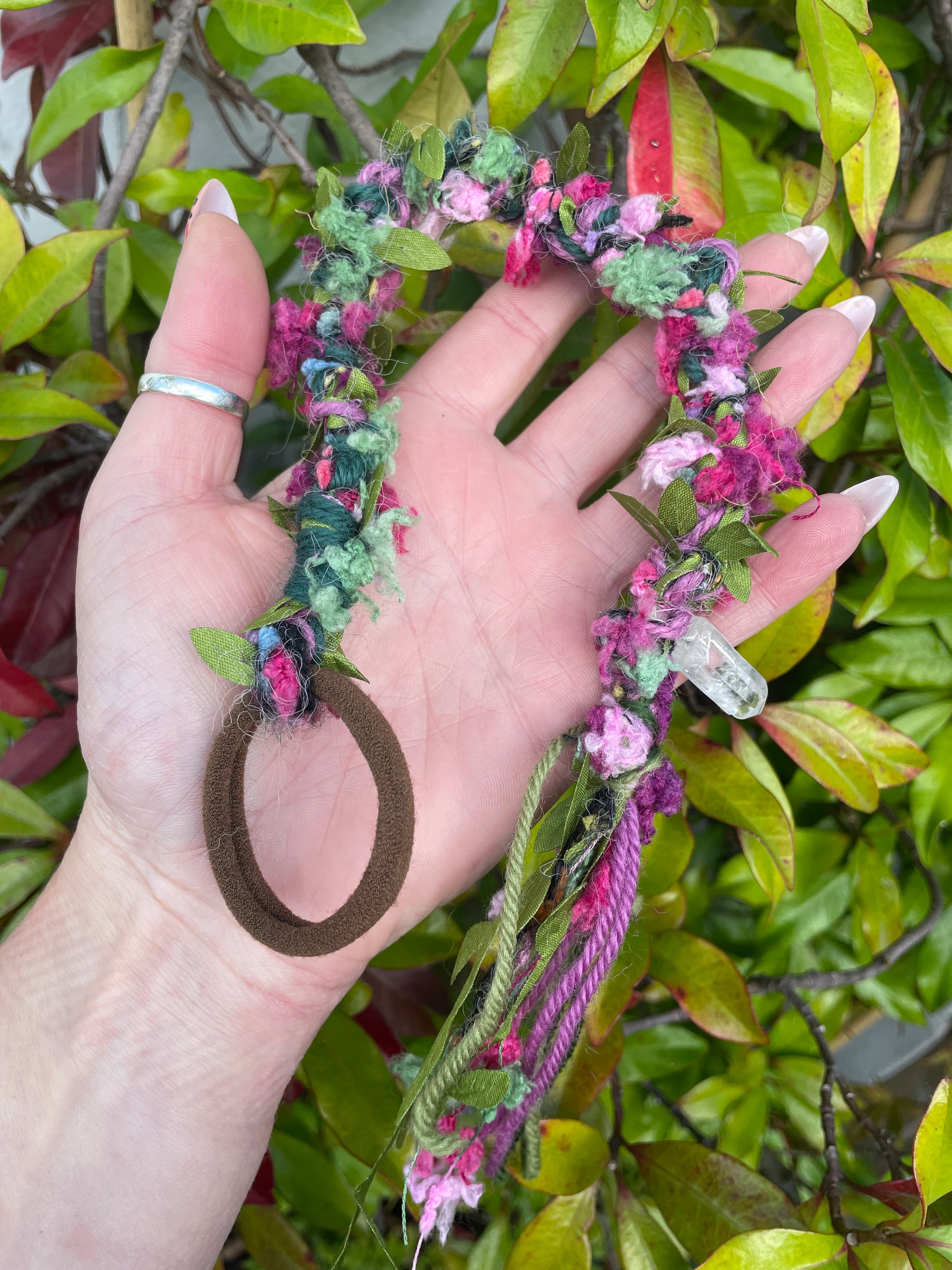 Fall in love with our posey wrap with added clear quartz crystal for healing on the go. Pretty in pink recycled yarns with spring green leaf ribbons