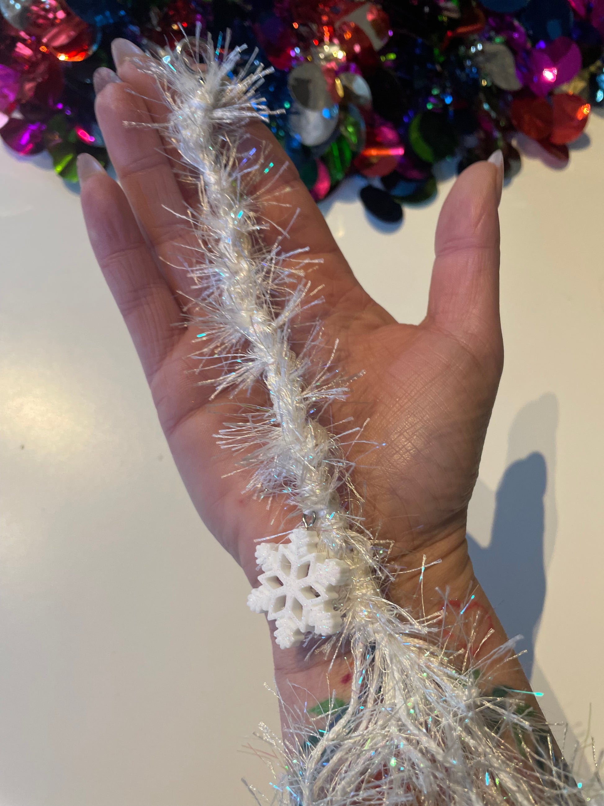Hanging upon a silver plated 8mm bead, this dazzling white iridescent tinsel wrap holds some wintery magic cheer with a massive glitzy snowflake. Go all ice queen or king vibe